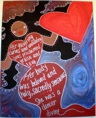Voluptuous, vibrantly alive and life-giving women dance through her paintings. She sees her art as a “redemptive act” because it highlights people whose stories are rarely heard and affirms their alternative forms of holiness.