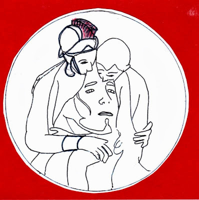 “Traces of His Presence” at the top of this post uses fluid lines and bold red to reveal the face of Christ in the holy space between the centurion and his beloved.
